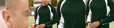84% polyester, 16% spandex knit; Odor-resistant; Wicks moisture away from the body; Ultra tight fit; 4-way stretch fabric allows for greater mobility and maintains shape; Self-fabric collar; Raglan sleeves;