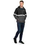 * 90% polyester/10% spandex, 4-way stretch woven fabric * Woven label * Front zipper with reflective zipper pull and matte tips * Contrast color sleeve pocket with silver media port and reflective metallic silicone welded zipper * Raglan sleeves for maximum mobility * Locking welt front pockets * Dual inside pockets * Spandex bound cuff * Open bottom with adjustable elastic hidden drawcord * Water-repellent