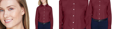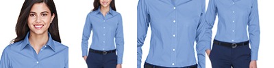 3.4 oz., 55% cotton, 45% polyester; Fine yarn count shirting; True Non-iron performance straight from the dryer; stain release finish; Active Fit; Patented pucker-free taped seams; Fused collar, cuffs, and placket; Split back seam with bias cut back yoke; straight collar; pearlized buttons; front and back princess seams for a flattering feminine fit; bust darts for a flattering feminine fit;
