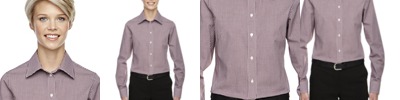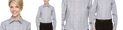 3.4 oz., 55% cotton, 45% polyester broadcloth; Fine yarn count shirting; True non-iron performance straight from the dryer; Stain release finish; true Non-iron performance straight from the dryera; Pearlized buttons; Patented pucker-free taped seams; Specially fused collar, cuffs and placket; Split back seam with bias cut back yoke; Straight collar; Sront and back princess seams for a feminine fit; Bust darts for a feminine fit;