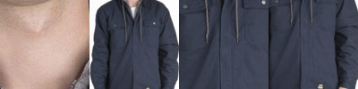 - Self-fabric zipper garage at top and bottom of placket